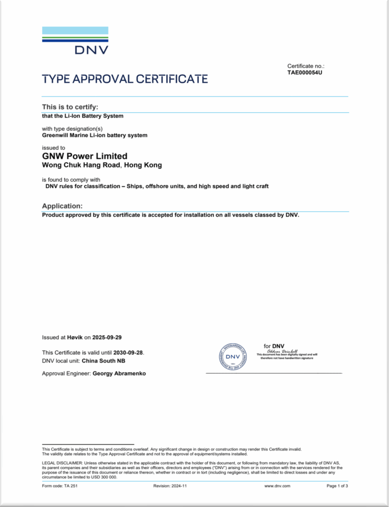We are thrilled to announce that GNW Power Limited has received official DNV approval, confirming compliance with DNV rules for classification – Ships, offshore units, and high speed and light craft. This certification verifies that our products are accepted for installation on all vessels classed by DNV, in line with the relevant DNV guidelines and standards.